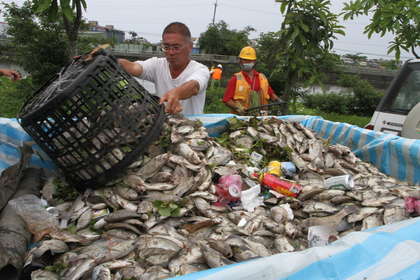 今天上午9時(shí)45分,民眾發(fā)現(xiàn),五結(jié)鄉(xiāng)五股排水五十二甲橋下游浮現(xiàn)大量吳郭魚、烏仔魚等淡水魚類,死魚綿延長(zhǎng)達(dá)2公里且有惡臭。環(huán)保局派員打撈清除,環(huán)保局綜合科長(zhǎng)郭峰志說(shuō),估計(jì)死魚上萬(wàn)尾,宜蘭縣動(dòng)植物防疫所已采集魚體化驗(yàn),厘清是否毒物污染造成。