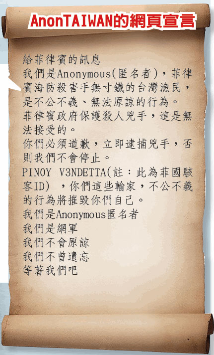臺(tái)灣黑客群AnonTAIWAN的網(wǎng)頁(yè)宣言。(圖片來(lái)自臺(tái)灣《聯(lián)合晚報(bào)》)