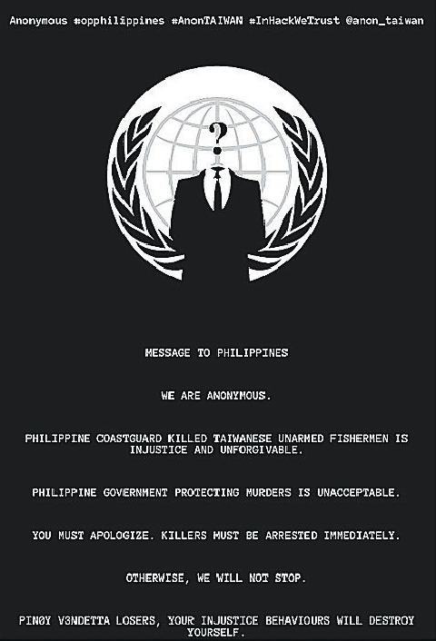 AnonTAIWAN匿名者組織駭入dns.gov.ph網(wǎng)站的首頁(yè),留下網(wǎng)站宣言。(圖片來(lái)自臺(tái)灣《聯(lián)合晚報(bào)》)
