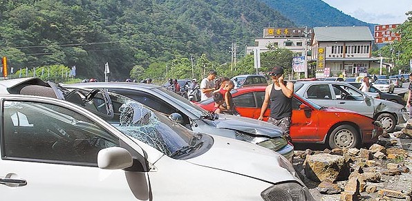 臺灣南投縣臺14線觀音瀑布路段,?柯愤叺臄(shù)輛車,被地震時滾落的石塊砸毀。(圖片來自臺媒)