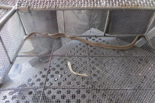消防人員不知道蛇的品種和大小,于是小心翼翼的打開書包,果真看到一條大約30公分、不知名的蛇躲在書包底部,迅速用手把蛇抓起來,關(guān)進(jìn)籠子里,解除一場虛驚。