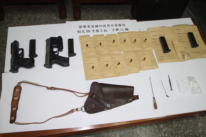 警方現(xiàn)場查獲葉男自盡裝有紅外線瞄準器的制式90手槍及另一把90手槍、子彈11發(fā)。