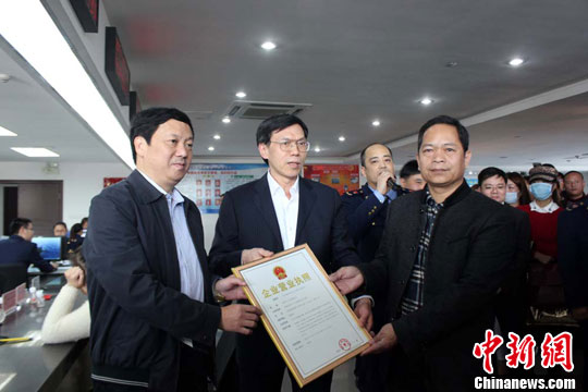 12月2日,平潭工商管理部門向臺商薛清德頒發(fā)改革后首本《企業(yè)營業(yè)執(zhí)照》。中新社發(fā) 郭熙嬋 攝
