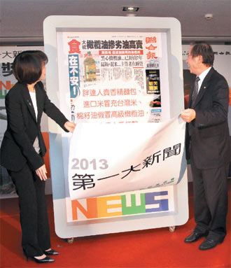 臺(tái)灣《聯(lián)合報(bào)》與張榮發(fā)基金會(huì)“票選2013第一大新聞”結(jié)果昨揭曉。張榮發(fā)基金會(huì)執(zhí)行長(zhǎng)聶國維(右)、聯(lián)合報(bào)總編輯游美月(左)公布第一大新聞為假油等食安新聞。圖片來源:臺(tái)灣《聯(lián)合報(bào)》