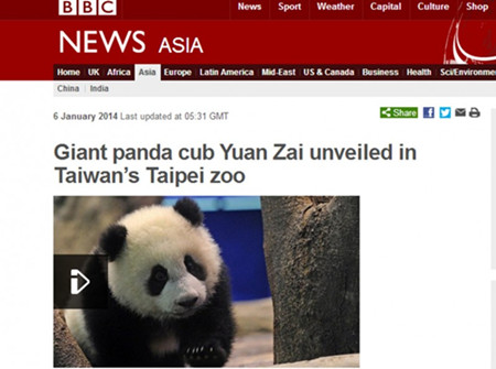 1月6日,大陸贈(zèng)臺(tái)大貓熊“團(tuán)團(tuán)”、“圓圓”所生寶寶“圓仔”首次亮相,國(guó)際媒體爭(zhēng)相報(bào)道。圖為英國(guó)媒體BBC網(wǎng)站的報(bào)道。(圖片來(lái)自臺(tái)媒)