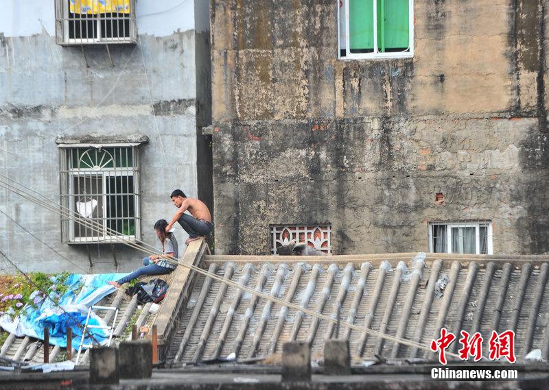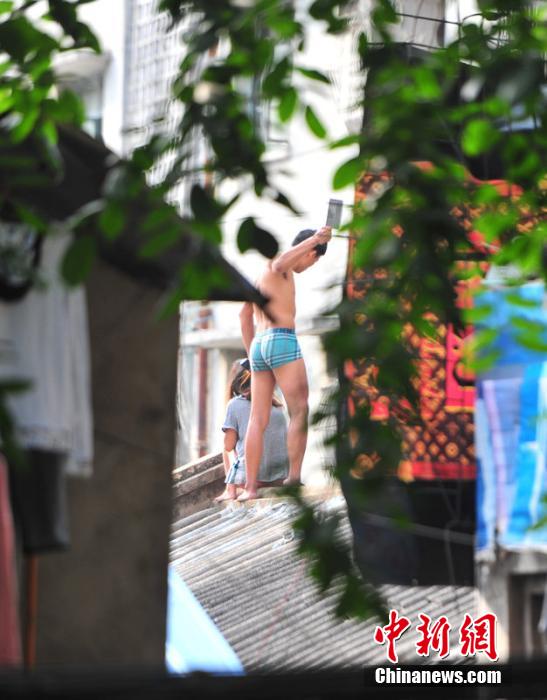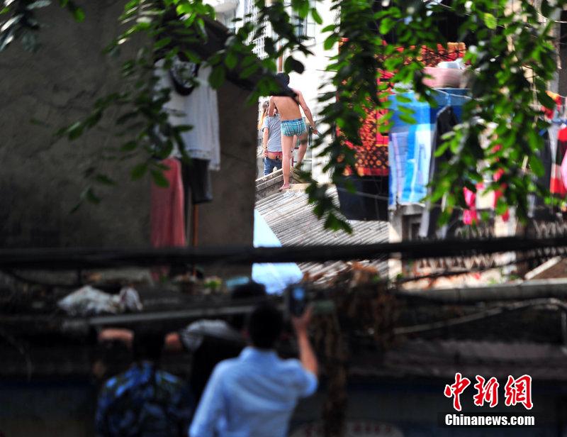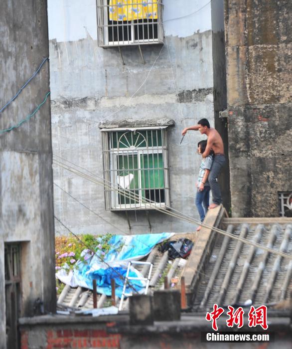 當(dāng)天下午15時(shí)許,在一居民樓樓頂上,一名半裸男子手里拿著一把菜刀,揪著一名半裸女子的頭發(fā),男子情緒異常激動(dòng),不停地?fù)]舞手中的菜刀。當(dāng)時(shí)現(xiàn)場(chǎng)已被警方封鎖,數(shù)百名市民圍觀。