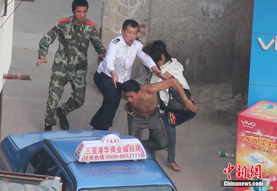 1月20日,位于三亞市建設(shè)街附近有一名半裸男子,手拿菜刀挾持了一名半裸女子。目前,該名男子已被警方控制,具體挾持原因正在進(jìn)一步調(diào)查之中。圖片來源:CFP視覺中國(guó)