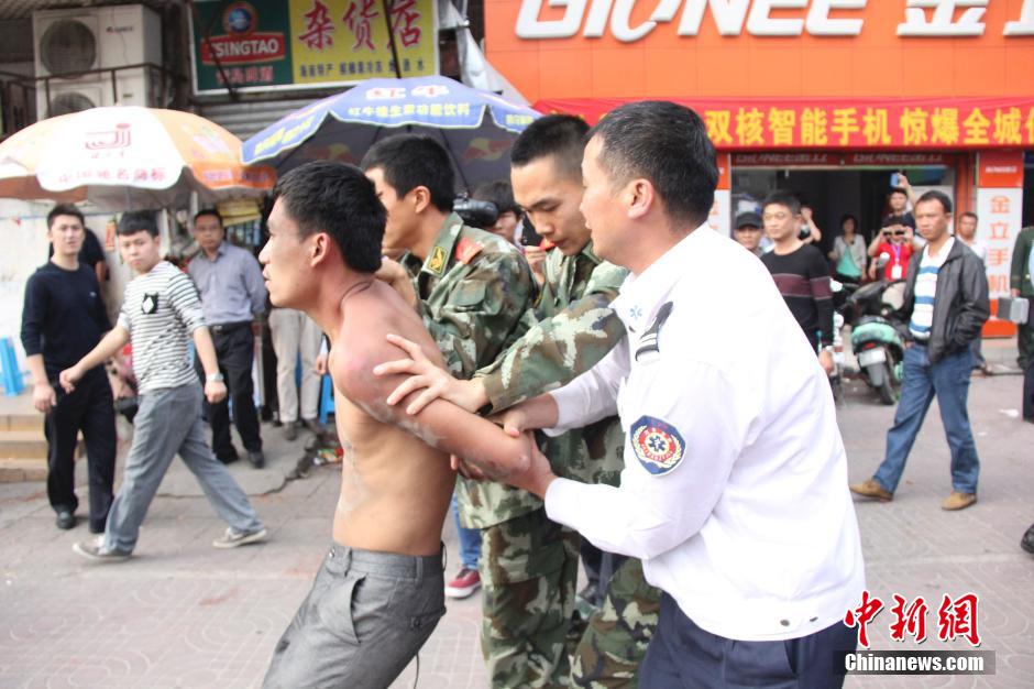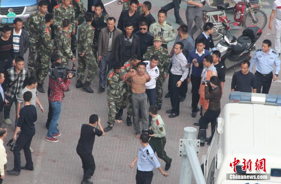 1月20日,海南省三亞市解放二路發(fā)生一起劫持人質(zhì)案件。警方經(jīng)過近5個(gè)小時(shí)的周旋,制服劫持人質(zhì)的持刀男子,成功解救被劫人質(zhì),人質(zhì)安然無恙。圖為男子被警方制服。中新社發(fā) 周君 攝