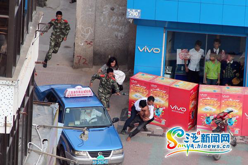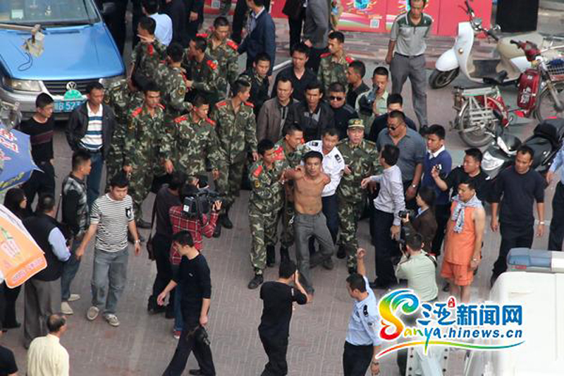 1月20日,位于三亞市建設(shè)街附近有一名半裸男子,手拿菜刀挾持了一名半裸女子。目前,該名男子已被警方控制,具體挾持原因正在進(jìn)一步調(diào)查之中。馬偉元 攝 圖片來源:三亞新聞網(wǎng)