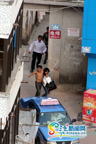 1月20日,位于三亞市建設(shè)街附近有一名半裸男子,手拿菜刀挾持了一名半裸女子。目前,該名男子已被警方控制,具體挾持原因正在進(jìn)一步調(diào)查之中。圖為男子挾持女子快步走向出租車。鄧松 攝 圖片來源:三亞新聞網(wǎng)