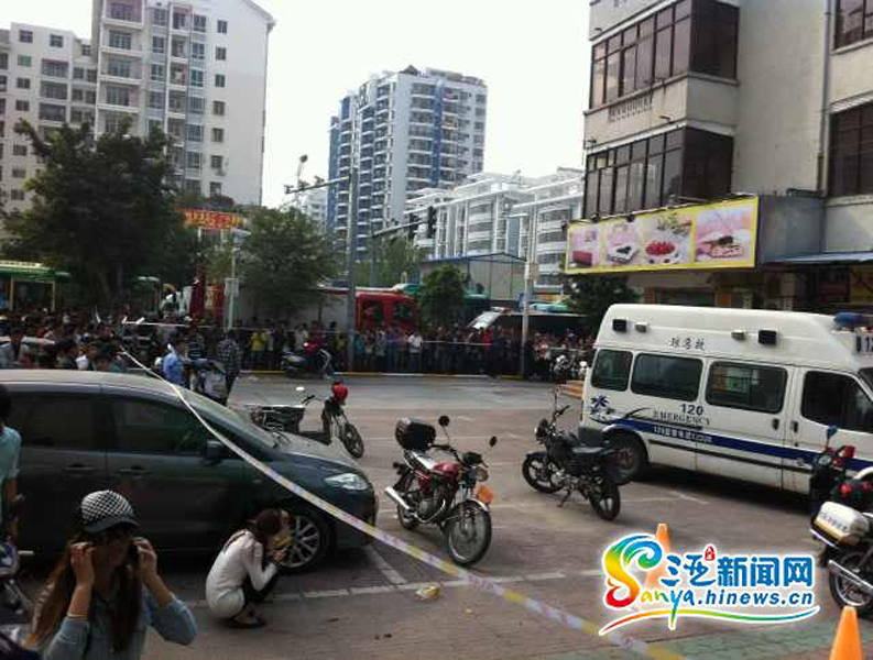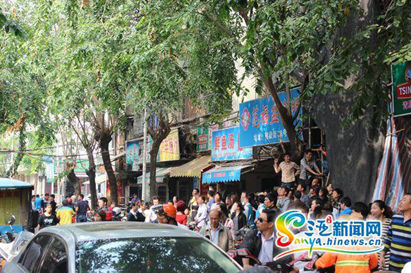 1月20日,位于三亞市建設(shè)街附近有一名半裸男子,手拿菜刀挾持了一名半裸女子。目前,該名男子已被警方控制,具體挾持原因正在進(jìn)一步調(diào)查之中。圖為圍觀的市民。馬偉元 攝 圖片來源:三亞新聞網(wǎng)