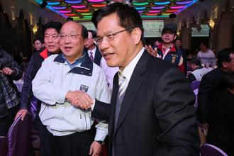 臺(tái)中市長(zhǎng)胡志強(qiáng)(左)與“綠委”林佳龍(右),今晚同場(chǎng)吃春酒,并以幽默方式相互較勁。 (圖片來(lái)源:臺(tái)灣聯(lián)合新聞網(wǎng))