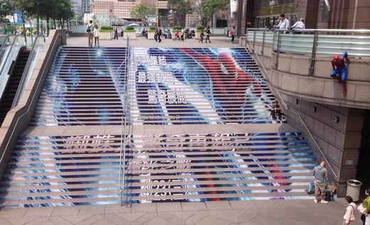 蜘蛛人造型栩栩如生,無論從遠(yuǎn)處還是從近處看,都像是蜘蛛人真的攀附在臺北101上,配合南方廣場階梯上的巨幅蜘蛛人、電光人對峙貼圖,叫路過行人莫不睜大眼睛觀看。
