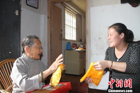沈阿婆向晚輩展示自己做的“神衣”!≈焐傥摹z