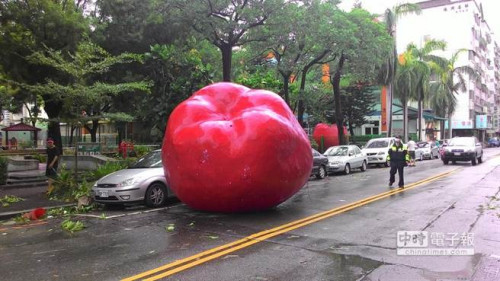 另據(jù)臺灣中時電子報報道,位在臺中市大墩十一街一間幼兒園,用來裝飾園區(qū)的大型紅蘋果,在蘇迪勒強風吹襲下,整顆蘋果從園區(qū)大樓掉了下來,掉出路面沿途滾了20幾米,占用了大墩十一路半個車道,也擦撞停放路邊的五輛轎車才停止。所幸大蘋果是空心體,沒有造成多大的災損,民眾看到路中央突然出現(xiàn)一顆大蘋果,覺得很訝異,還有人停下車來拍照,最后在附近民眾的合力幫忙之下才將大蘋果滾進園區(qū),讓道路交通恢復順暢。
