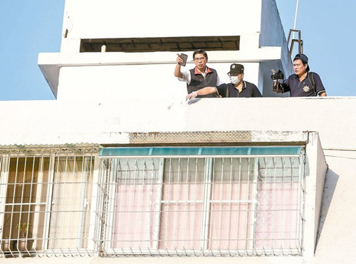 高雄市鳳山區(qū)林森路發(fā)生夫殺妻后再跳樓自殺的悲劇,警方鑒識人員到頂樓采證。(臺灣《聯(lián)合報》/程宜華 攝)