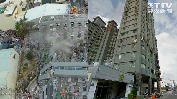 臺南市維冠金龍大樓倒塌前后對比。(圖片來源:臺灣東森新聞)