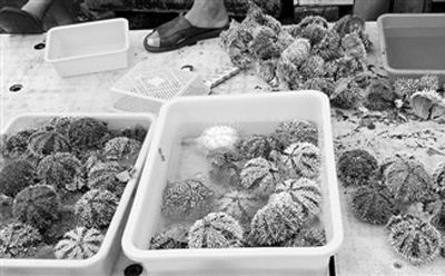 澎湖海膽采捕如期開放,5月16日清晨,馬公第三漁港可見攤販與漁民銷售,吸引不少游客和當地民眾搶頭香,現場搶鮮開挖裝盒,大的1顆賣70元(新臺幣),也有3顆賣100元的。 鐘 揚攝(中新社發(fā))