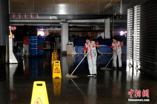 6月3日,臺(tái)灣桃園機(jī)場(chǎng)地下二層擺放著多個(gè)防滑提示牌,清潔工持續(xù)清洗地板。桃園機(jī)場(chǎng)及周邊2日遭遇強(qiáng)降雨,據(jù)機(jī)場(chǎng)地下二層商鋪老板介紹,水一度淹到倉(cāng)庫(kù)內(nèi)約半米高。 中新社記者 陳小愿 攝