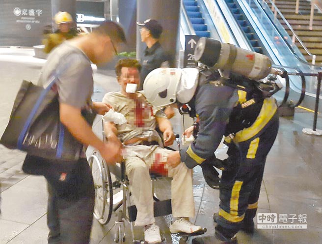 圖為爆炸發(fā)生后,嫌犯肺部及腿部受傷,救護(hù)人員協(xié)助坐輪椅送醫(yī)。(臺(tái)媒圖)