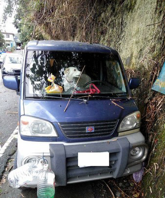 嫌犯將車(chē)就停在偏僻的山邊,并將與之四處流浪的愛(ài)犬留在車(chē)上,保險(xiǎn)桿上也掛著一桶汽油。(圖片來(lái)源:臺(tái)灣東森新聞云)