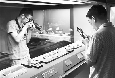 九月一日起至十二月一日,臺(tái)北故宮博物院試行開(kāi)放拍照、攝影。圖為參觀者正在認(rèn)真拍照。吳景騰攝