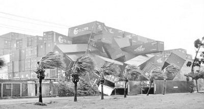 圖為“莫蘭蒂”強(qiáng)臺(tái)風(fēng)橫掃高雄,高雄港碼頭邊堆置的數(shù)十個(gè)貨柜,被強(qiáng)風(fēng)吹得東倒西歪。(圖片來(lái)自聯(lián)合報(bào))