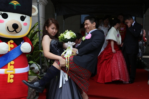 新北市第2場(chǎng)聯(lián)合婚禮,今在淡水漁人碼頭舉行,走濃濃英倫風(fēng),有新人著蘇格蘭裙。來(lái)源:臺(tái)灣《聯(lián)合報(bào)》(新北市民政局提供)