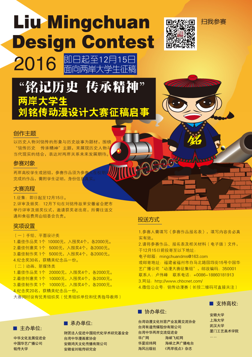 為紀(jì)念臺灣首任巡撫劉銘傳誕辰180周年,以“銘記歷史 傳承精神”為主題的兩岸大學(xué)生劉銘傳動漫設(shè)計大賽已于近日正式啟動,向兩岸大學(xué)生廣泛征集多種形式的動漫作品,反映劉銘傳的人物形象與歷史故事。