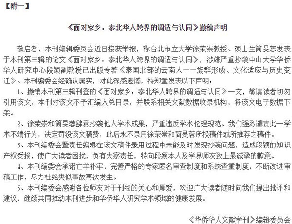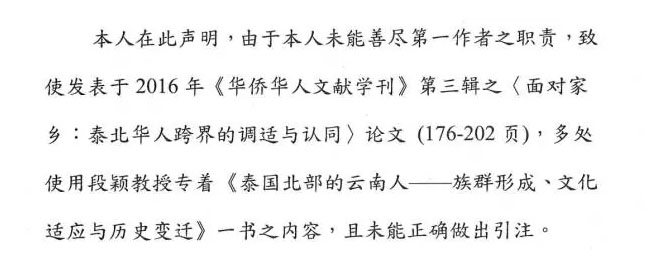 段穎說,在發(fā)現(xiàn)抄襲后,《華僑華人文獻學刊》編委會核對后,及時與他聯(lián)系,先行致歉,并商議撤稿事宜。