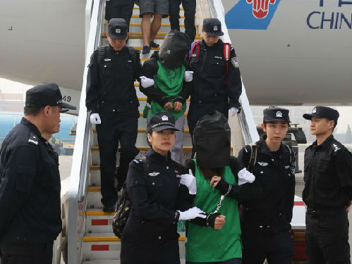 2016年4月13日,在肯尼亞實施電信詐騙的部分犯罪嫌疑人被包機押解回國。該犯罪團伙中包括32名中國大陸犯罪嫌疑人和45名臺灣犯罪嫌疑人。新華社發(fā)