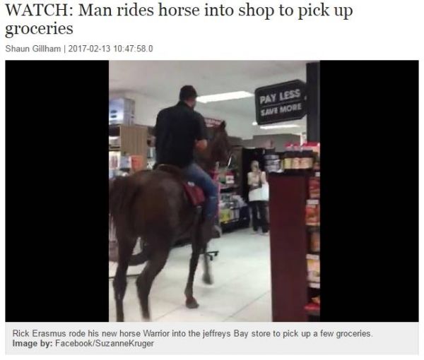 參考消息網(wǎng)2月15日報道臺媒稱,南非1名男子日前突發(fā)奇想,竟然騎著1匹馬進(jìn)入1家超市購物。馬兒穿梭在不成比例的貨架間顯得有些驚慌失措,店經(jīng)理獲悉后立即請男子離開。