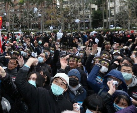 數(shù)百名臺(tái)鐵產(chǎn)業(yè)工會(huì)上月在寒風(fēng)中抗議,爭(zhēng)取依法休假,并把被記曠職復(fù)印件丟向交通部。臺(tái)灣聯(lián)合報(bào)系資料照