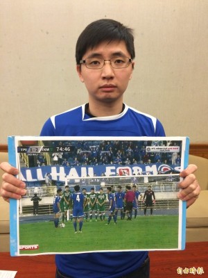 這是“藍(lán)色疾風(fēng)加油團(tuán)”代表林詠晨舉著被要求撤下的“臺(tái)獨(dú)”旗幟。