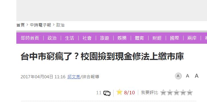 環(huán)球網(wǎng)綜合報道 臺中市國民黨團日前召開記者會,批評市長林佳龍“偉人佳龍”舉債爆增。臺灣“聯(lián)合新聞網(wǎng)”3日又報道稱,臺中市各級學校這學期收到一份公文,內(nèi)容是修訂各!皻w屬臺中市所有拾得物要點”,最受關(guān)注的是規(guī)定以后在校內(nèi)撿到現(xiàn)金,全要列冊繳市庫。
