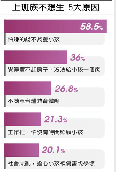 中國臺灣網(wǎng)4月14日訊 據(jù)臺灣《聯(lián)合報》報道,2008年,臺灣新生兒的出生數(shù)首度跌破20萬大關,2010虎年更只剩16萬余人,2012年龍年才回升至近10年最高的23萬余人,但后來又減少。去年出生人數(shù)僅20萬7600人。少子化已成臺灣社會的重大危機之一,但為什么臺灣人這么害怕生寶寶呢?一份調查說出了真相。(見上圖)