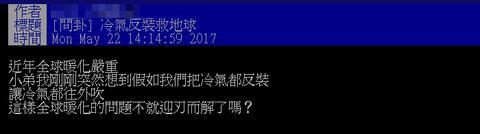 據(jù)東森新聞報道,這名網(wǎng)友發(fā)帖提到關(guān)于解決全球暖化的辦法,他表示,“假如我們把冷氣都反裝,讓冷氣都往外吹,這樣全球暖化的問題不就迎刃而解了嗎?”
