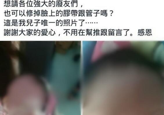 中國(guó)臺(tái)灣網(wǎng)6月26日訊 據(jù)臺(tái)灣“東森新聞云”報(bào)道,一位喪子的媽媽?zhuān)诰W(wǎng)絡(luò)上貼出兩張新生兒的照片,征求“P圖大神”替她的兒子修一張身上沒(méi)有膠帶和管子的照片,她在文末加注:“這是我兒子唯一的照片了。”這位媽媽?xiě)烟?月卻遭遇難產(chǎn),網(wǎng)友們聽(tīng)后紛紛給她打氣。