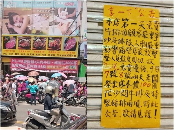 牛排店老板發(fā)公告無奈撤回“免費(fèi)牛排”活動(dòng)。(圖片來源:臺(tái)灣“東森新聞云”)