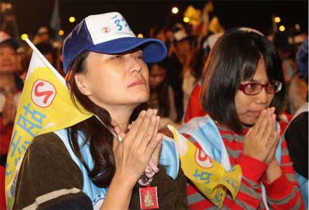 胡志強(qiáng)26晚的造勢(shì)晚會(huì)上,民眾雙手合十為連勝文祈福。來(lái)源:臺(tái)灣《中國(guó)時(shí)報(bào)》