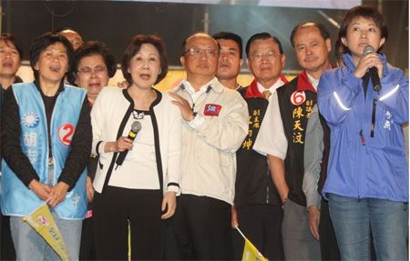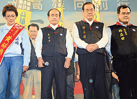 臺(tái)灣“立法院長(zhǎng)”王金平(中)與黃昭順(左二)等競(jìng)選團(tuán)隊(duì)成員,26日在造勢(shì)晚會(huì)上為連勝文祈福。來(lái)源:臺(tái)灣《中國(guó)時(shí)報(bào)》