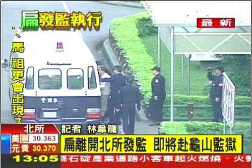 12月2日下午1時(shí)37分左右,陳水扁囚車在警方車隊(duì)戒護(hù)下抵達(dá)臺(tái)北監(jiān)獄,入監(jiān)服刑。【詳細(xì)】