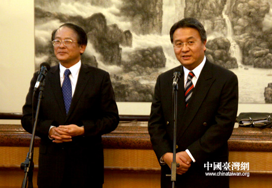 “兩岸經(jīng)濟(jì)合作框架協(xié)議”第三次兩會(huì)專家工作商談13日在北京舉行。圖為商談結(jié)束后,海協(xié)會(huì)理事唐煒與;鶗(huì)顧問(wèn)黃志鵬回答記者提問(wèn)。(中國(guó)臺(tái)灣網(wǎng) 張弛 攝)