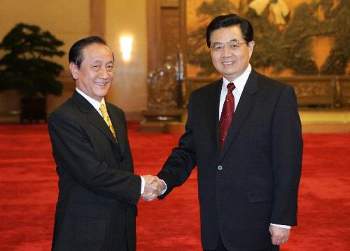 7月12日,中共中央總書記胡錦濤在北京人民大會(huì)堂會(huì)見新黨主席郁慕明率領(lǐng)的新黨紀(jì)念抗戰(zhàn)勝利60周年大陸訪問團(tuán)一行。 新華社記者 馬占成 攝