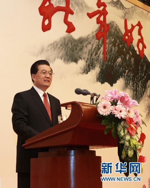 今天是2011年元旦。在這一元復(fù)始、萬象更新的喜慶時(shí)刻,我們?cè)谶@里歡聚一堂,暢敘友情,共議國是,感到十分高興。首先,我代表中共中央、國務(wù)院和中央軍委,向各民主黨派、工商聯(lián)和無黨派人士,向各人民團(tuán)體,向全國廣大工人、農(nóng)民、知識(shí)分子、干部和各界人士,向人民解放軍指戰(zhàn)員、武警官兵和公安民警,向香港特別行政區(qū)同胞、澳門特別行政區(qū)同胞、臺(tái)灣同胞和海外僑胞,向關(guān)心和支持中國現(xiàn)代化建設(shè)的國際友人,致以節(jié)日的祝福!祝大家新年好!
