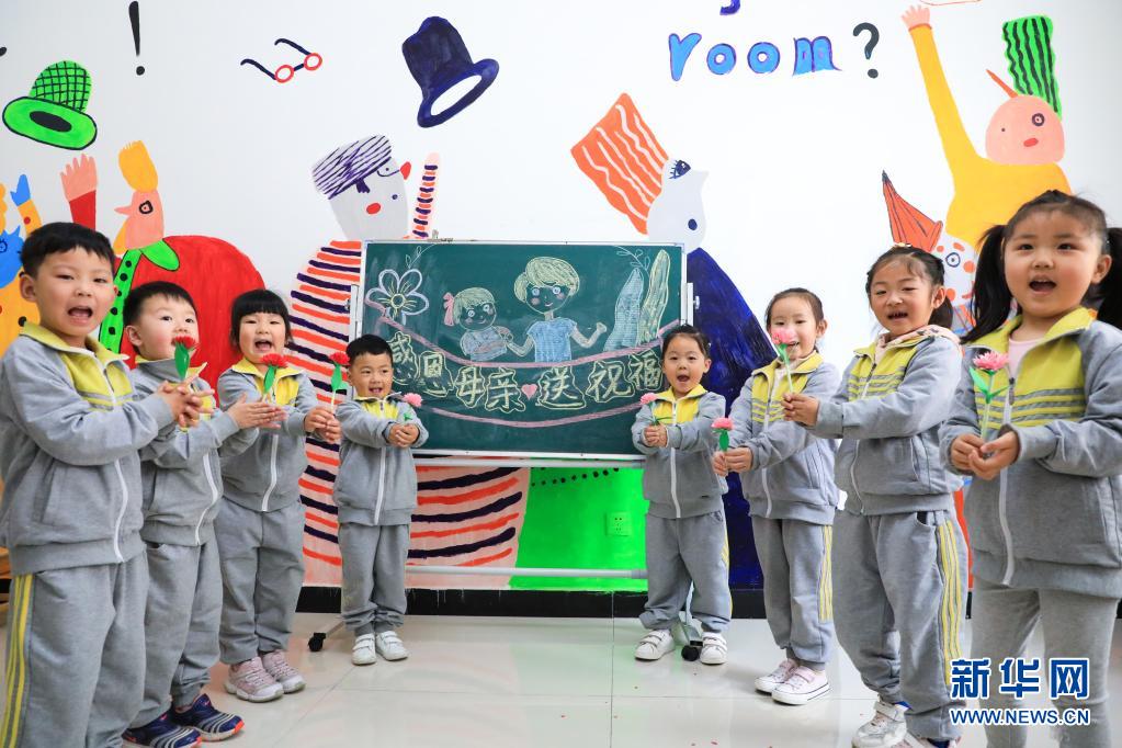 5月8日,在江蘇省連云港市贛榆區(qū)御水灣金色搖籃幼兒園,小朋友們展示親手為媽媽制作的手工康乃馨花束作品。母親節(jié)來(lái)臨之際,孩子們通過(guò)各種各樣的方式,表達(dá)對(duì)母親的感恩之情!⌒氯A社發(fā)(徐誠(chéng) 攝)