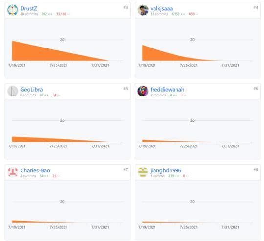 GitHub代碼托管平臺記錄下每位程序員的貢獻圖。坐標軸上顯示了隨著時間變化,代碼的改動數(shù)目。