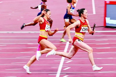 8月6日,田徑女子4×100米接力決賽在新國立競技場舉行。圖為中國隊隊員韋永麗(右)、黃瑰芬在比賽中。新華社發(fā)