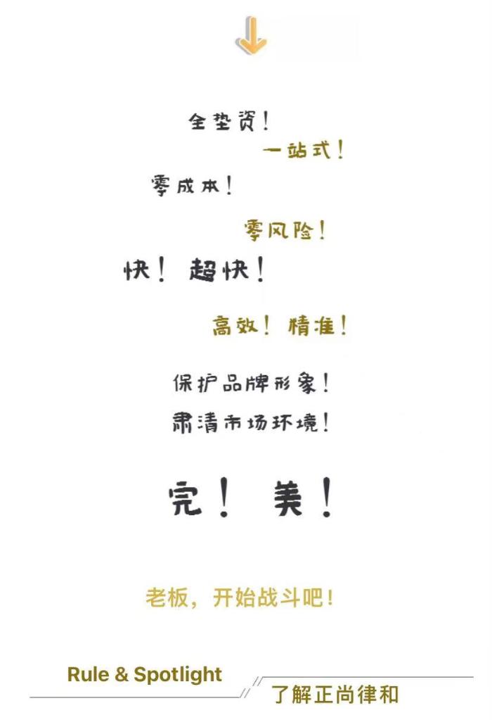 正尚律和的微信公號“正尚律和知識產(chǎn)權(quán)”中有一篇《正尚律和是怎么幫企業(yè)打假的?》文章,道出了正尚律和的運作模式:文章宣稱委托方不用花一分錢,也不用出一個人。“正尚律和全國46個城市、32家律所的調(diào)查團(tuán)隊、專業(yè)律師就都是你的人”,文章還稱2000+員工全國范圍內(nèi)地毯式排查,用時15到45天,《全國侵權(quán)報告》出爐,“你說打誰我們就打誰”,用時30天左右“民事訴訟or協(xié)商解決or行政查處or刑事追究,你說了算”。文章還稱,整個過程全墊資,委托方零成本。