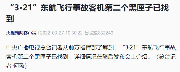 中央廣播電視總臺記者從前方指揮部了解到,“3·21”東航飛行事故客機第二個黑匣子已找到。詳細情況在隨后發(fā)布會上介紹。